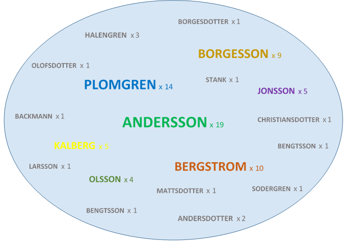 This name graphic shows the surnames (total surnames 18) and the number of individuals (total individuals 81) with that surname in the Onsala parish related to our family